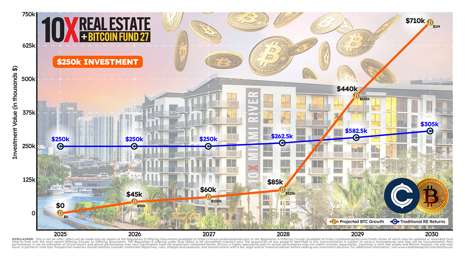 This chart shows a forward-looking comparison between traditional real estate performance and a strategy that combines real estate with Bitcoin. Real estate continues to be a proven asset class known for stable returns and cash flow.